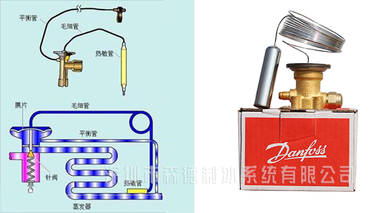 膨脹閥是制冷系統(tǒng)中的一個(gè)重要部件,由閥體、感溫包、平衡管三大部分組成,俗稱毛細(xì)血管。一般閥體安裝于蒸發(fā)器入口處。膨脹閥使中溫高壓的液態(tài)制冷劑通過其節(jié)流成為低溫低壓的液態(tài),然后制冷劑在蒸發(fā)器中吸收熱量達(dá)到制冷效果(結(jié)冰),膨脹閥通過蒸發(fā)器末端的過熱度變化來控制閥門流量,防止出現(xiàn)蒸發(fā)器面積利用不足和敲缸現(xiàn)象。一般常用的膨脹閥為熱力膨脹閥。